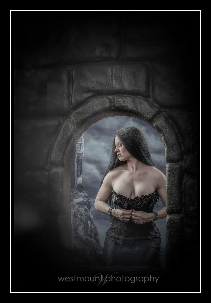 Here’s an idea. She had this amazing dress and bustier so I thought it cool to use the same backdrop for medieval portraits…. including the lantern, sword and other artistic effects….